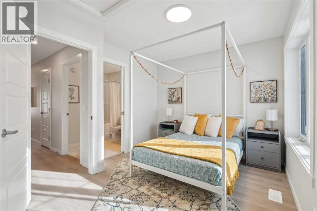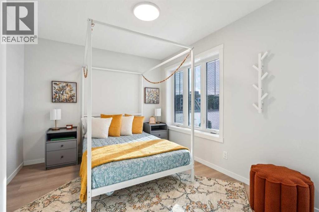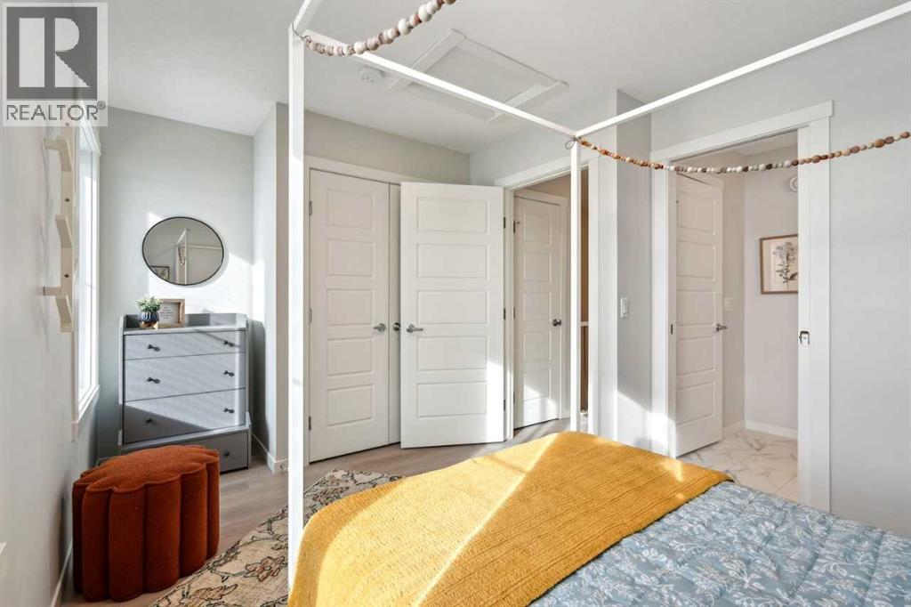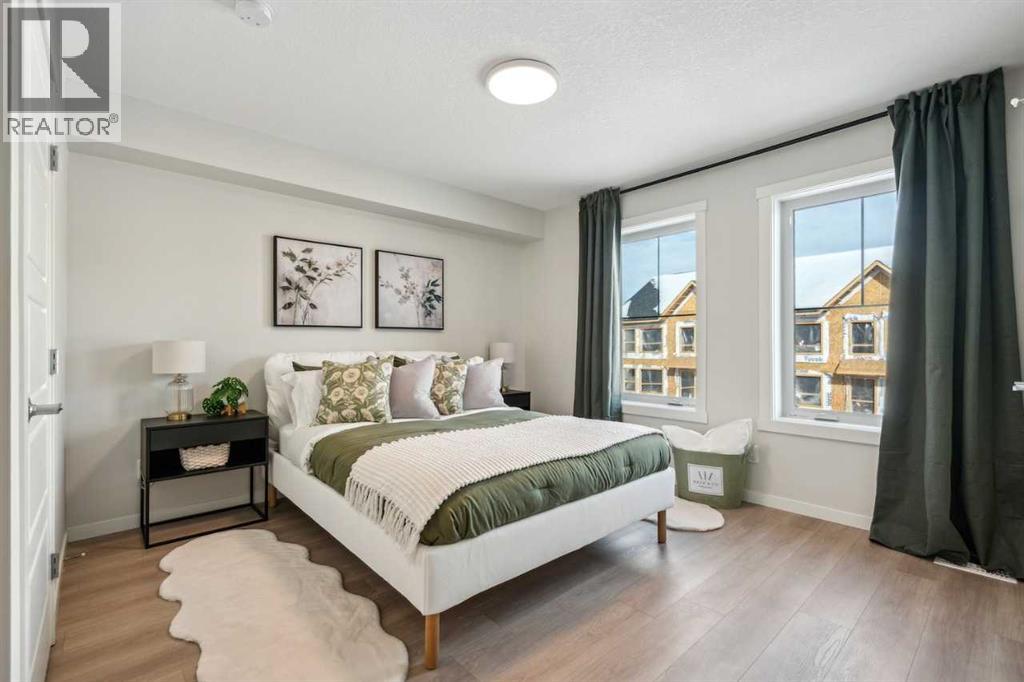 Welcome to Ambrosia, a beautifully designed 2-bedroom, 2.5-bath, two-storey stacked townhome in the scenic community of Crimson Ridge. Take in stunning views of the Bow Valley River, Downtown Calgary, and Canada Olympic Park, with a golf course just steps from your door. The open-concept main floor is perfect for entertaining, featuring a spacious kitchen island and luxury vinyl plank flooring throughout the main level and bathrooms. Upstairs offers two generous bedrooms designed for comfort and privacy, including a primary bedroom with walk-in closet and private ensuite, along with the convenience of upper-floor laundry. Built for superior energy efficiency with triple-pane windows and enhanced insulation, this home provides year-round comfort and reduced energy costs. Thoughtfully crafted for modern living. Photos are representative. (id:53676)