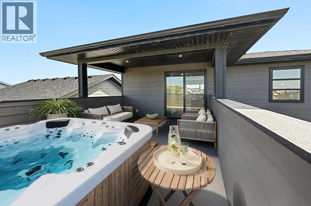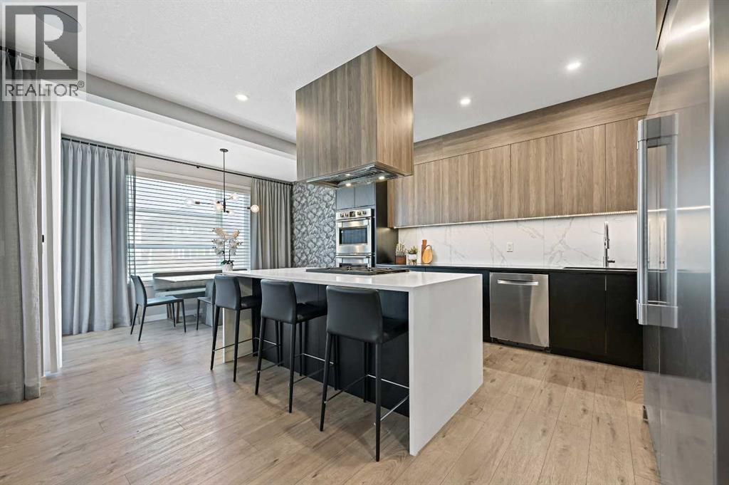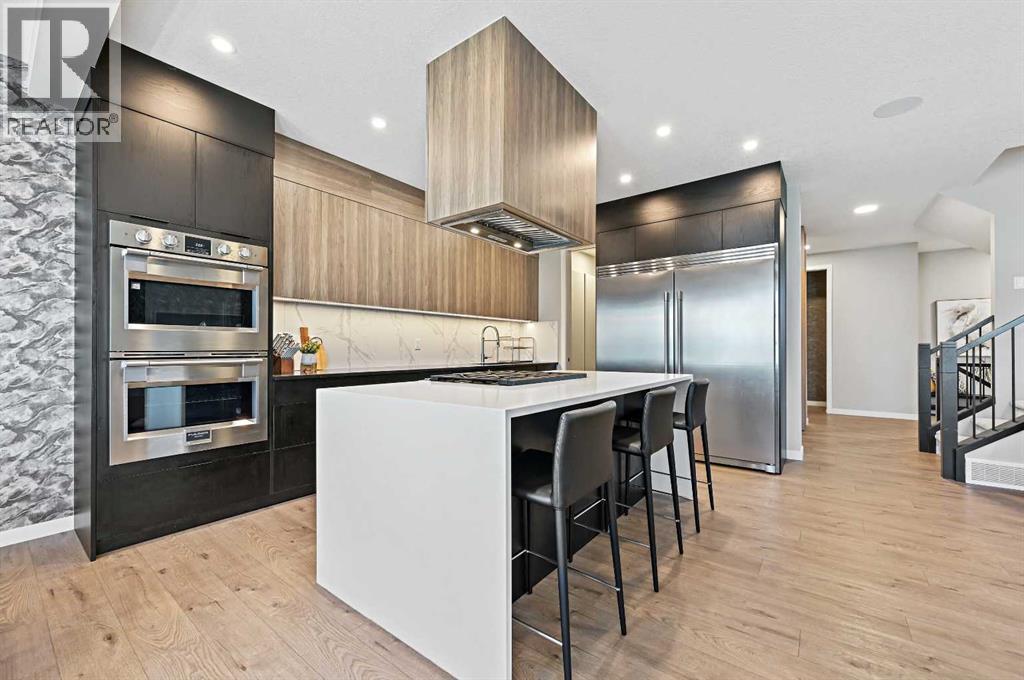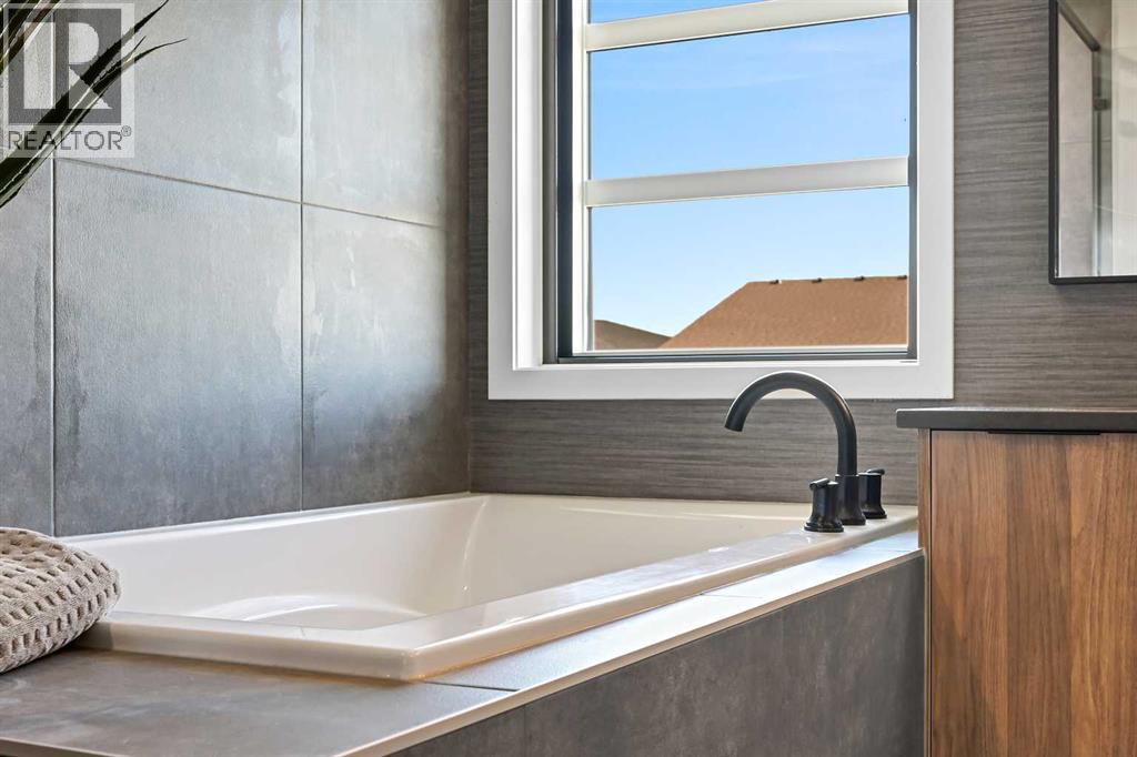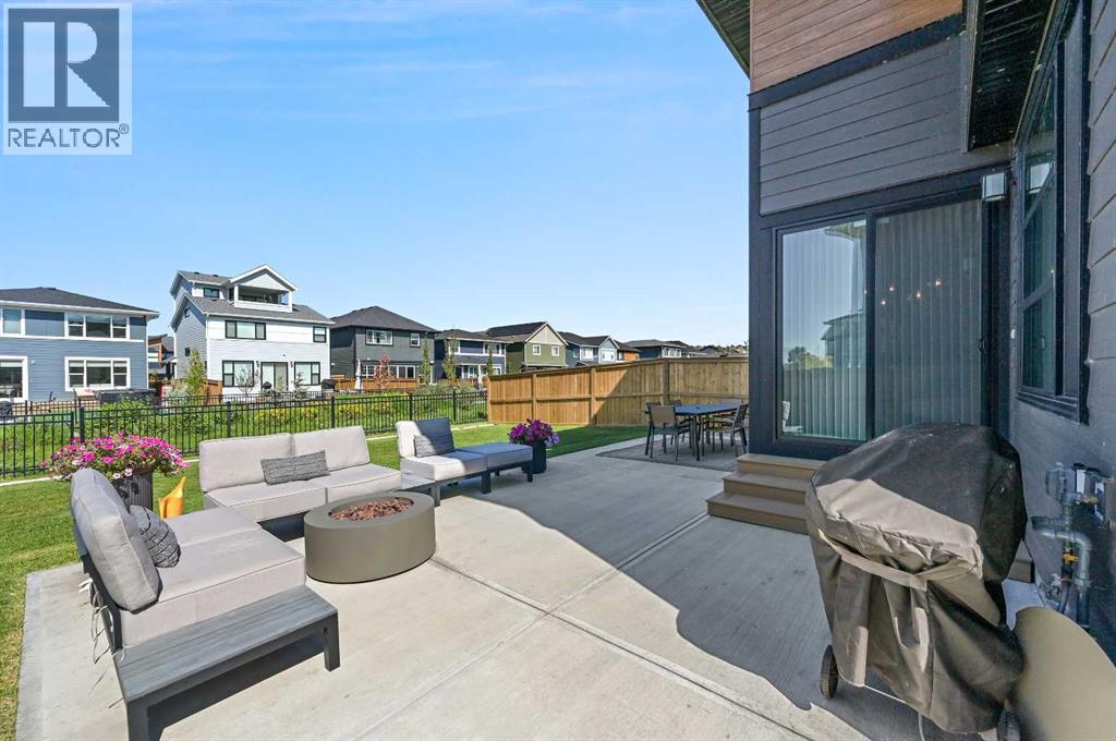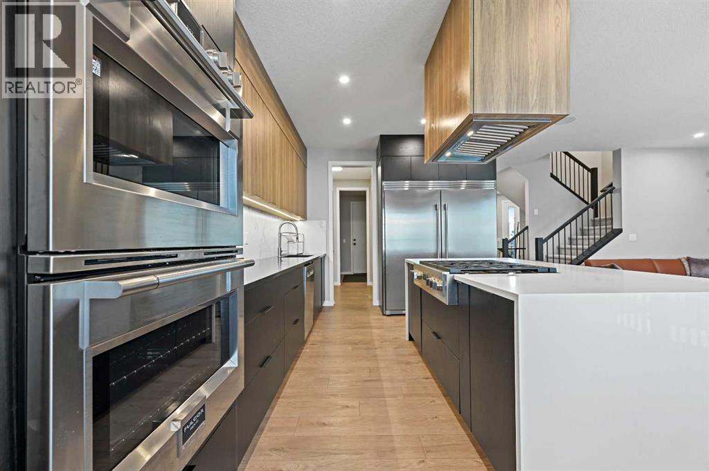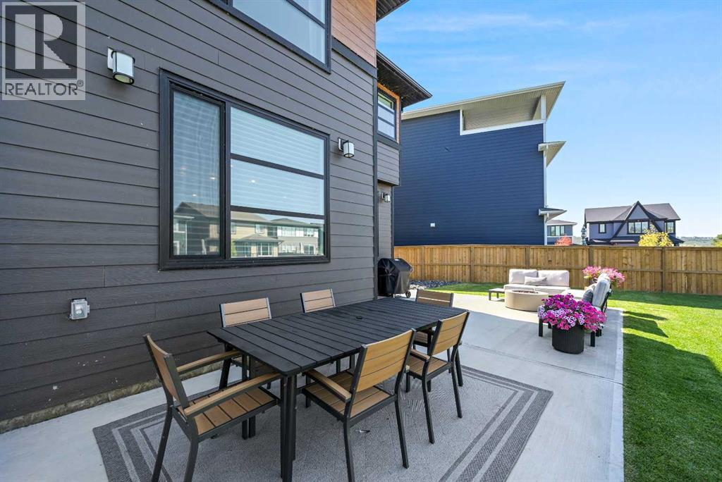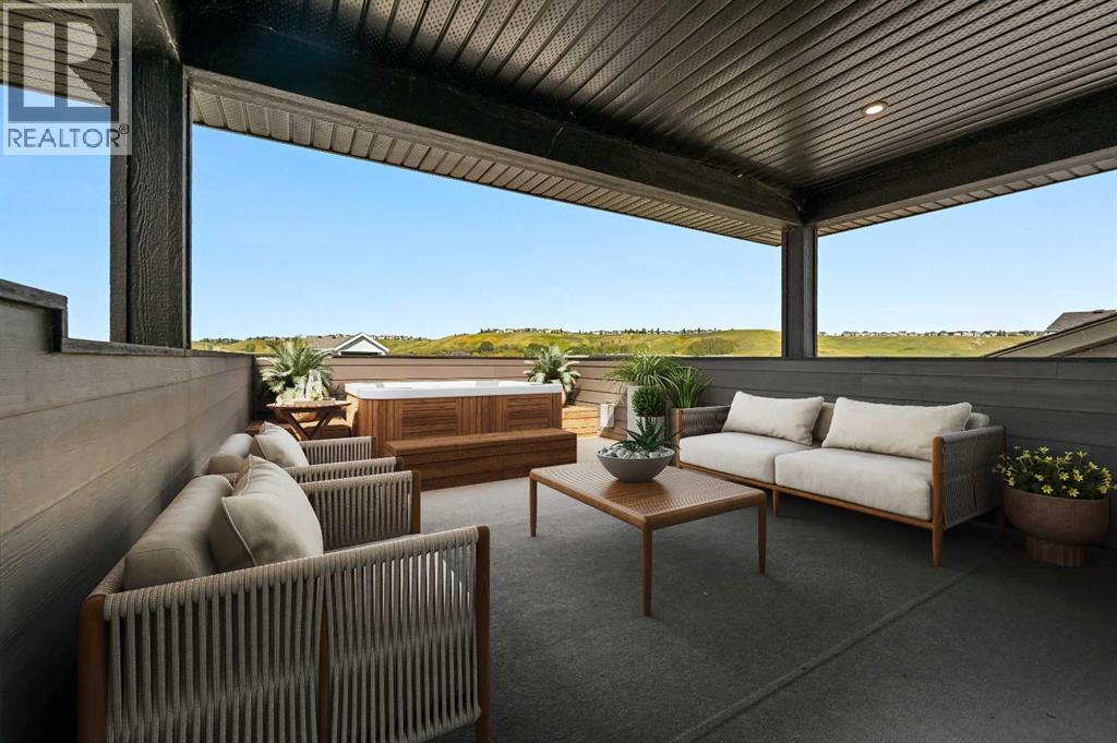 CLASSIC CEDARGLEN ESTATE | ORIGINAL OWNERS | RIVER VIEWS | ENGINEERED ROOFTOP 20' x 13' HOT TUB PATIO | 4 BEDROOMS + BONUS ROOM A true classic for the discerning buyer! Ideally located in Cranston, just steps from the Bow River pathways, Fish Creek Park, Century Hall, ice rink, ridge trails, schools, shopping, transit, and quick Cranston exits, this Cedarglen-built masterpiece blends lifestyle, location, and luxury. Meticulously crafted by the original owners, this urban-style home offers over 2,757 sq. ft. of elegant living space with 4 bedrooms, 3.5 bathrooms, a versatile third-floor bonus zone, and a covered rooftop hot tub patio with sweeping river views—a rare find. The main floor impresses with 9’ ceilings, wide-plank hardwood floors, designer lighting, an electric fireplace, wood staircase railings, and detailed trim throughout. At its heart is the spectacular chef’s kitchen, designed for both efficiency and entertaining: custom paneled cabinetry, quartz counters with a waterfall edge, matching quartz backsplash, upgraded Fulgor Milano stainless appliances including a 6-burner gas cooktop, a wood-clad hood cover, walk-through pantry, dramatic island with seating, and recessed lighting. The open layout seamlessly connects to the dining area and great room for modern family living. Upstairs, the primary retreat features a spa-like ensuite with a soaker tub, glass shower, dual sinks, and walk-in closet. Three additional bedrooms, an upper laundry room, and a spacious central bonus room complete the level. Other highlights include an unspoiled basement with 9 ceilings, a huge pie-shaped backyard with valley views, a 32-foot by 11-foot concrete patio plus BBQ area, and a quiet cul-de-sac setting backing onto a central green space. Stunning curb appeal with stone detailing, concrete walkways, and a covered front entry add to the charm. This is not just a home—it’s a lifestyle, combining estate-level finishes, thoughtful design, and one of Cranston’s most desirable locations. Quick possession available—call your friendly REALTOR® today to schedule your private tour! (id:53676)