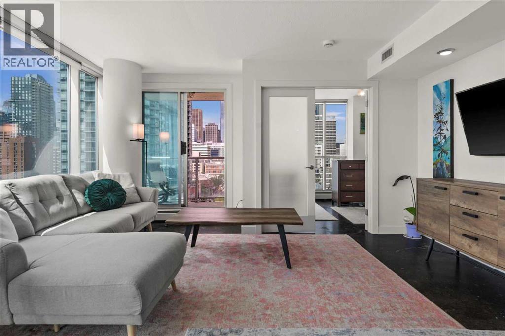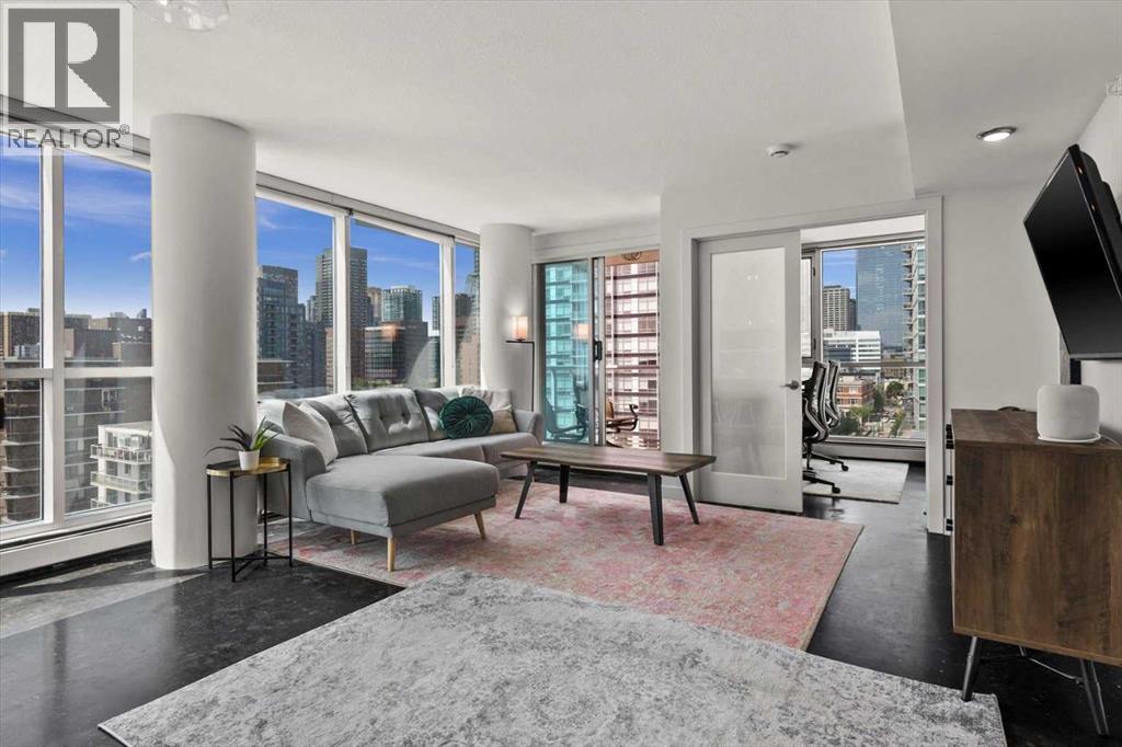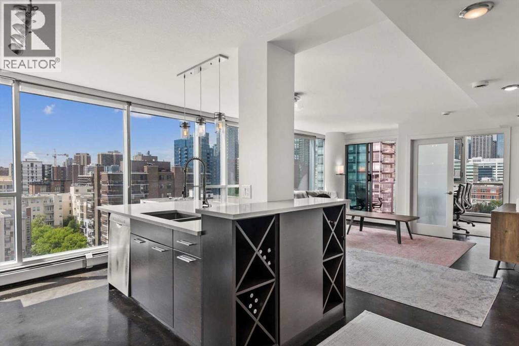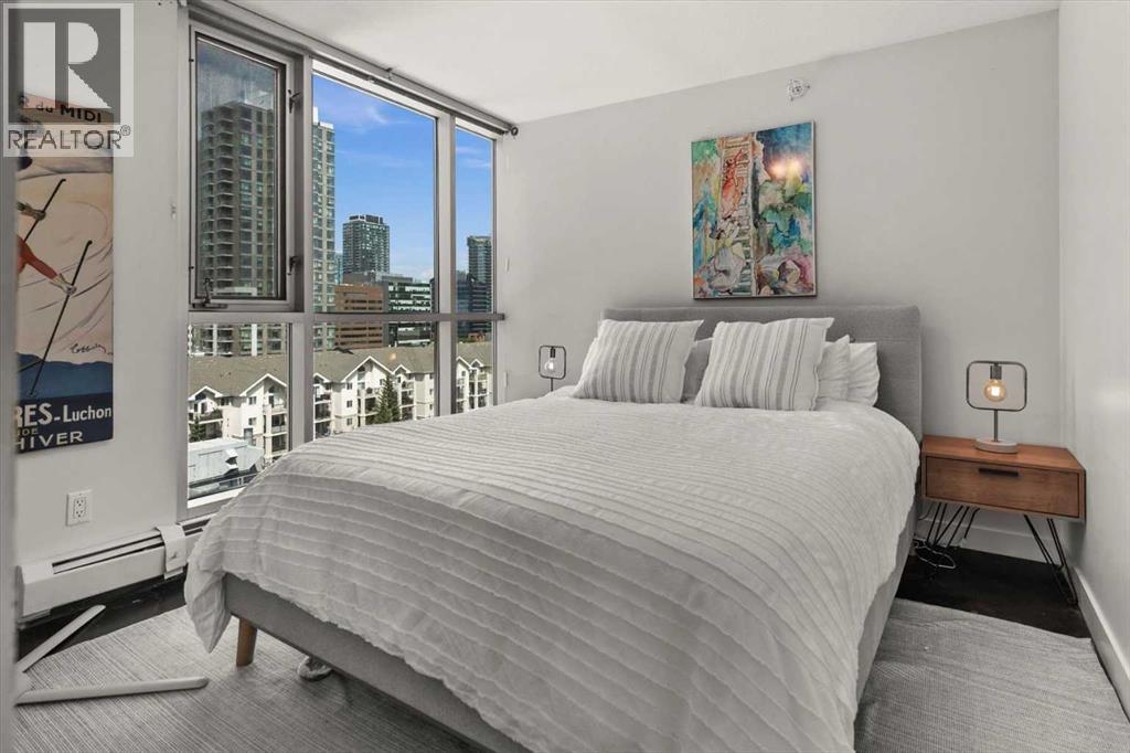 FLOOR-TO-CEILING WINDOWS | WEST FACING CORNER UNIT | DOWNTOWN VIEWS | MODERN UPGRADES| Soak in the incredible downtown views from this sleek 2-bedroom condo, where floor-to-ceiling windows bring the city skyline right into your living room. Located in The Chocolate building in the heart of Victoria Park, enjoy the ultimate urban lifestyle just off 1st Street and 17th Ave offering incredible restaurants, cocktail bars, and coffee shops, all while just a short distance from the Calgary Saddledome and Stampede Park. Designed for both comfort and style, the open-concept layout features polished concrete floors and a fully upgraded kitchen complete with quartz countertops, sleek stainless steel appliances, bright cabinetry, and a large island offering plenty of space to host and entertain. The main living area is the perfect spot to relax and enjoy the city views with floor-to-ceiling windows throughout. Wake up each morning to breathtaking views of the iconic Calgary Tower, perfectly framed from your NW facing patio, the ideal spot to enjoy your morning coffee. The second bedroom offers versatile space, perfect for a comfortable home office or guest room. The updated 4-piece bathroom features a sleek modern vanity and ample storage. Additional features include in-suite laundry, a titled underground parking stall, complimentary bike storage, and a common courtyard patio for you to enjoy during these summer months. Whether you're a first-time buyer, urban professional, or investor, this condo delivers exceptional value and an unbeatable location! *CHECK OUT 360 VIRTUAL TOUR* (id:53676)