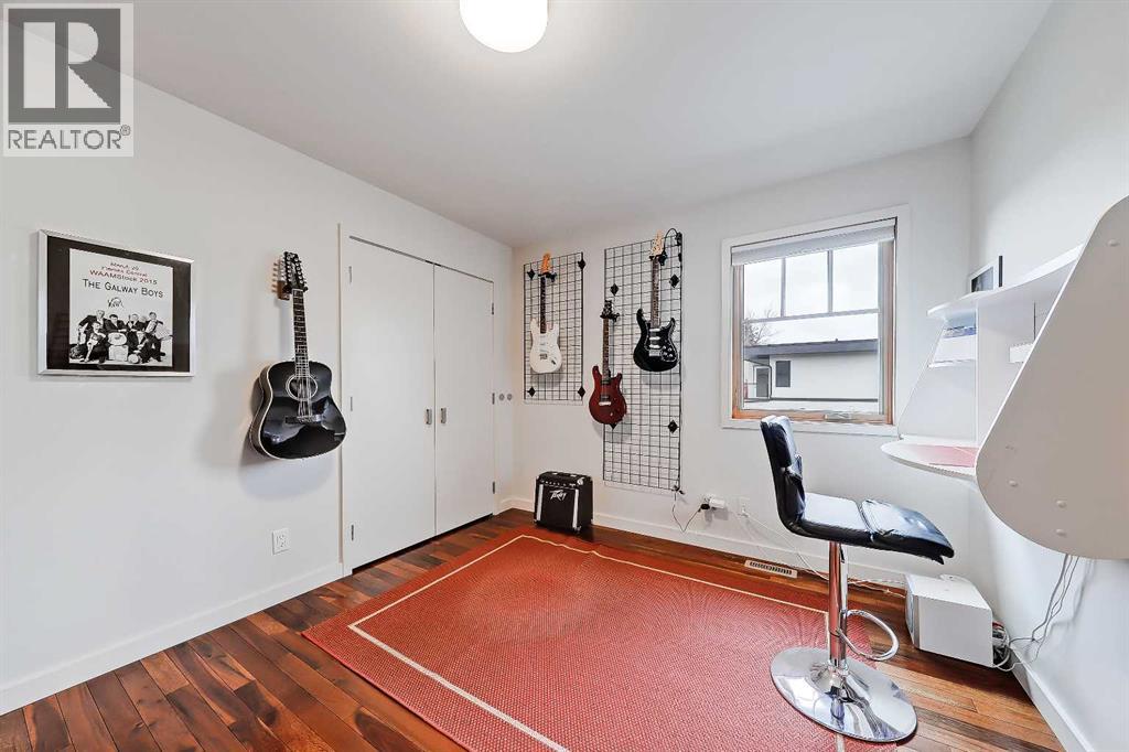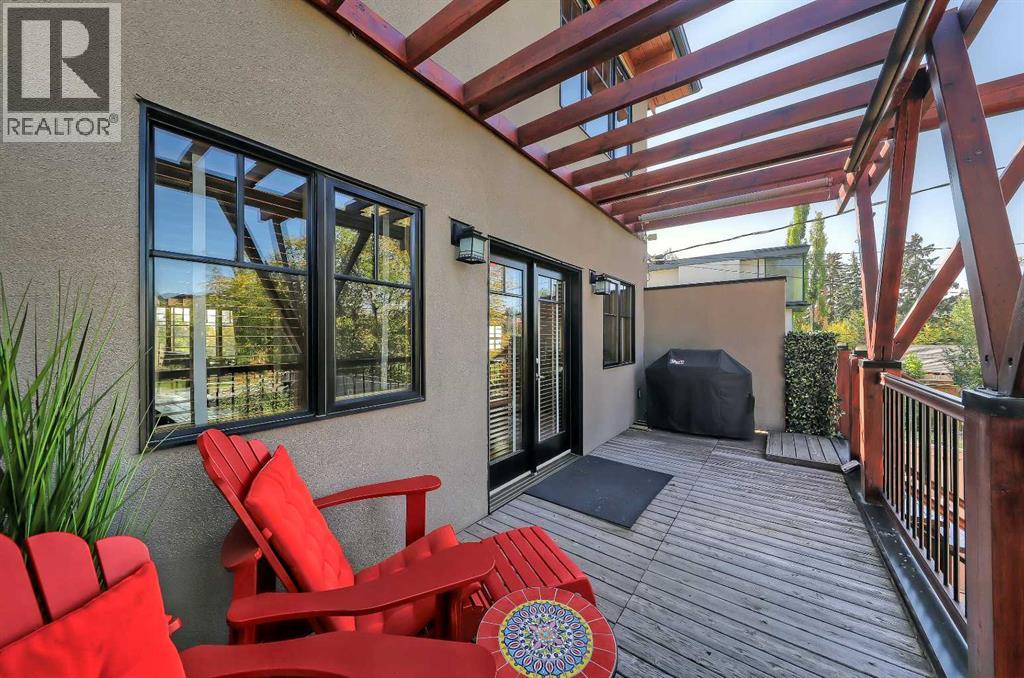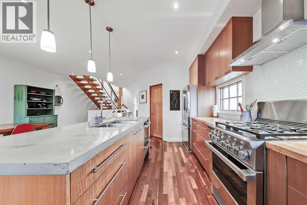 *Open House Sunday, October 26th from 1pm - 4pm* Quick possession available and updated photos! Discover this stunning semi-detached home in the heart of Parkdale, offering a blend of natural design and modern amenities. Step inside to a “modern mountain cabin” aesthetic, featuring acacia hardwood floors, fir interior doors, and oversized windows that fill the main floor with natural light. The inviting living room boasts a cozy gas fireplace, while the chef’s kitchen impresses with a walk-in pantry, custom cabinetry, premium stainless steel appliances, butcher block countertops, glass tile backsplash, and a concrete-topped island with bar seating. The spacious dining area opens to the upper rear deck through French doors, ideal for entertaining.Upstairs, the primary suite offers large windows, a walk-in closet, and a barn door leading to a luxurious five-piece ensuite with dual sinks, a freestanding soaker tub, tiled glass steam shower, and heated travertine floors. Two additional bedrooms with built-in closets share a four-piece bath, and a barn-door-enclosed laundry closet adds convenience. Handcrafted barn doors throughout the home serve as unique artistic features. The fully developed lower level includes a recreation room with flexible gym space, a two-piece bathroom, and a tiled mudroom/foyer with direct access to the heated double garage. Additional amenities include Vacmuflow rough-in, snow-melt system rough-in for the driveway, and under-stair storage. Just minutes from the Bow River Pathways and transit routes, offering easy commuting to the Foothills Hospital, University of Calgary and Downtown. (id:53676)