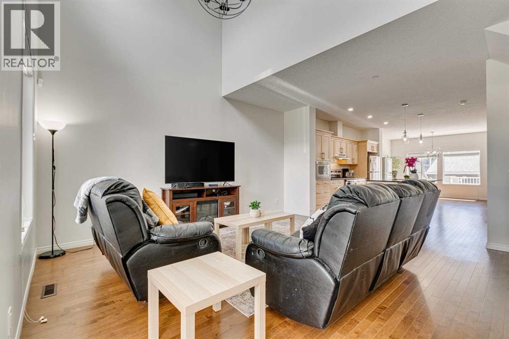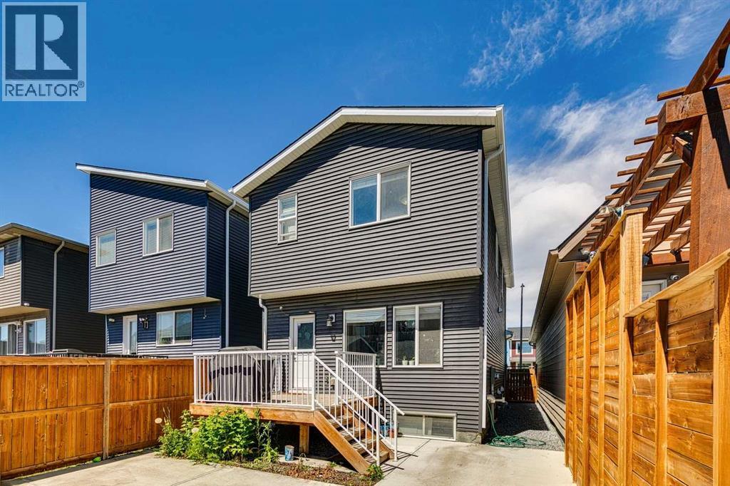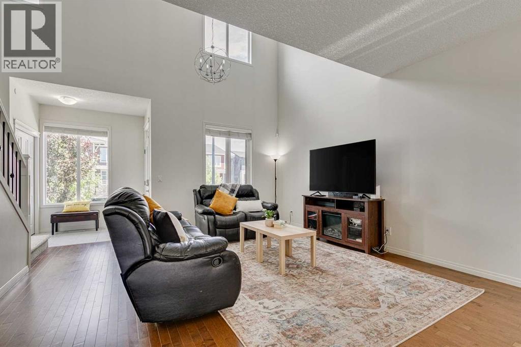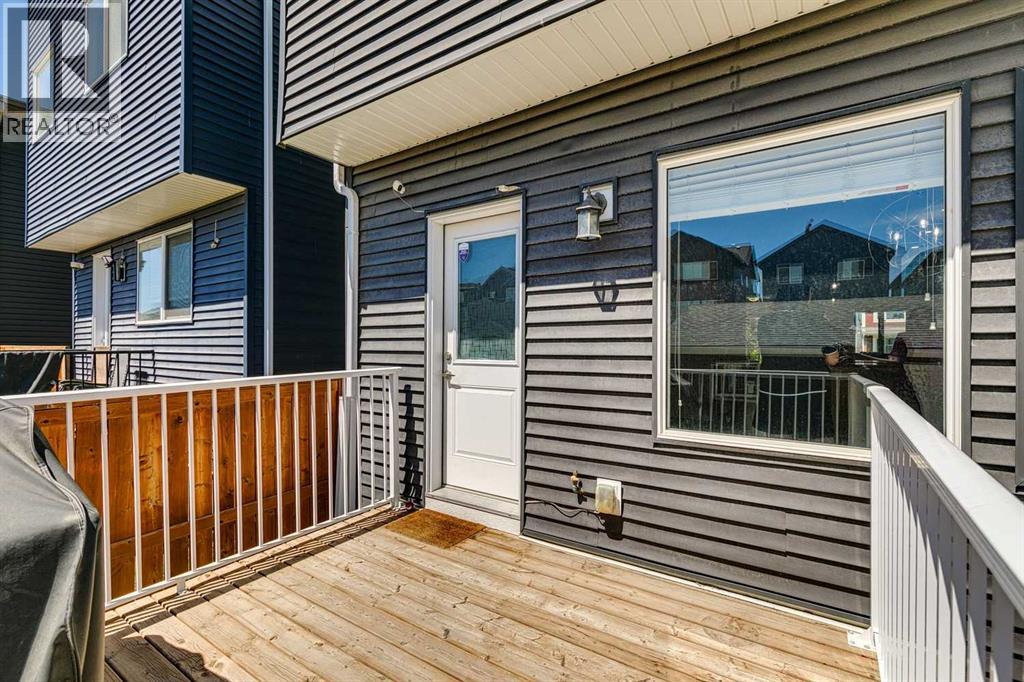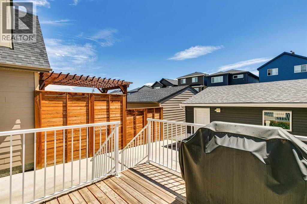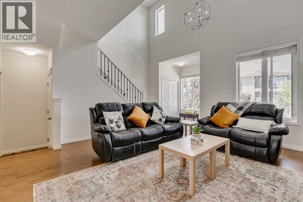 Welcome to this inviting and well-maintained home, offering fantastic curb appeal with a charming front yard that sets the tone for what’s inside. Step through the front door into a spacious foyer with a large closet, perfect for storing coats and shoes. The main floor features an airy living room with soaring ceilings open to above, hardwood floors, and tile for easy upkeep. The kitchen is a chef’s delight with stainless steel appliances, a built-in microwave, a breakfast bar, and a walk-in pantry. The sunny, south-facing dining area fills with natural light, and a convenient powder room completes the main level.Upstairs, you’ll find three comfortable bedrooms, including a primary retreat with a 3-piece ensuite, and a well-appointed 4-piece bathroom to serve the additional bedrooms. The basement is unfinished and ready for your personal vision—ideal for adding value and extra space.Enjoy outdoor living in the backyard, which features a good-sized deck, privacy partitions, low-maintenance landscaping, and convenient back alley access. Located within walking distance to the vibrant Livingston Hub and HOA amenities, and just minutes from Stoney Trail and Deerfoot Trail for a quick commute across the city, this home offers the perfect blend of comfort, convenience, and community living. (id:53676)