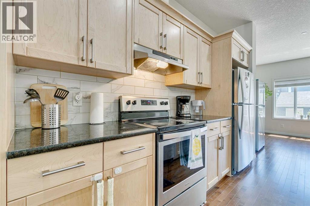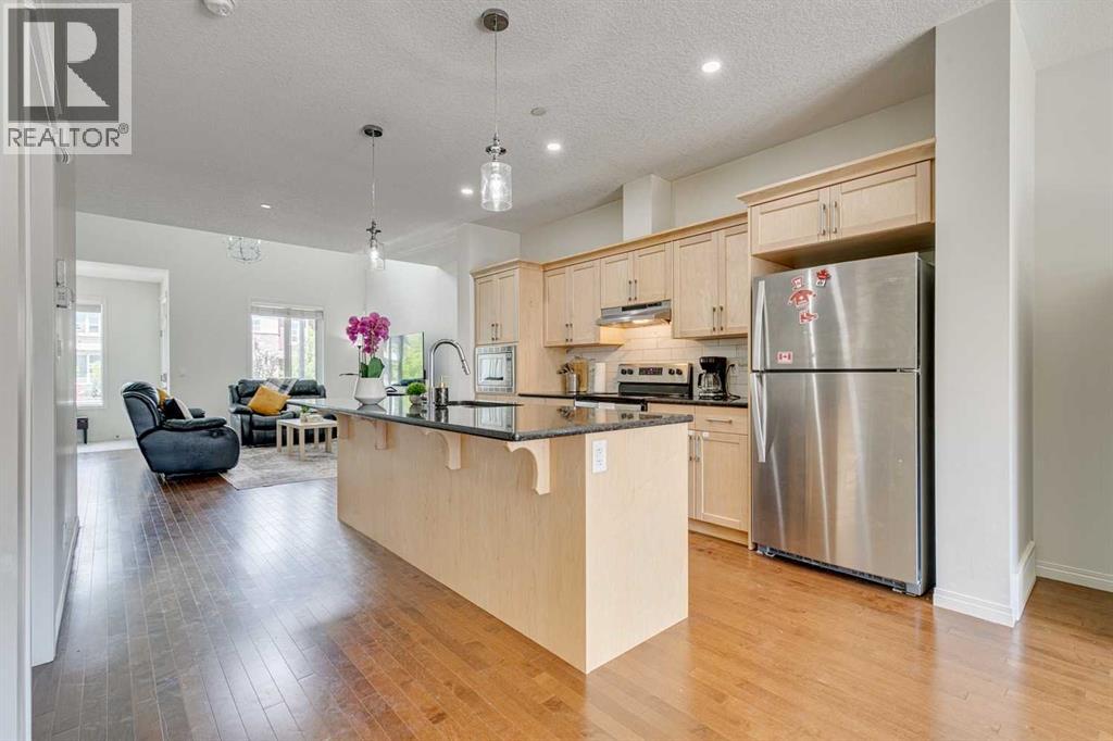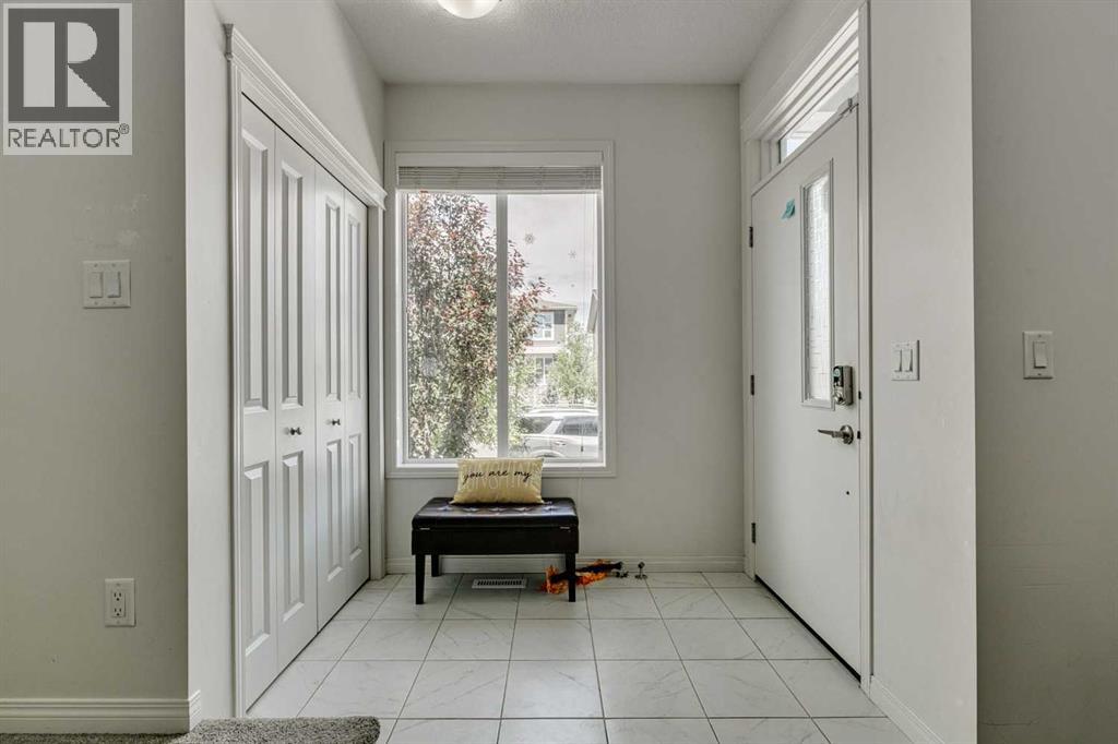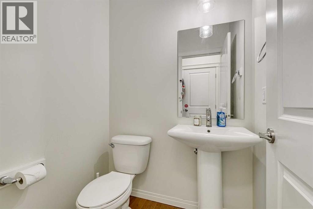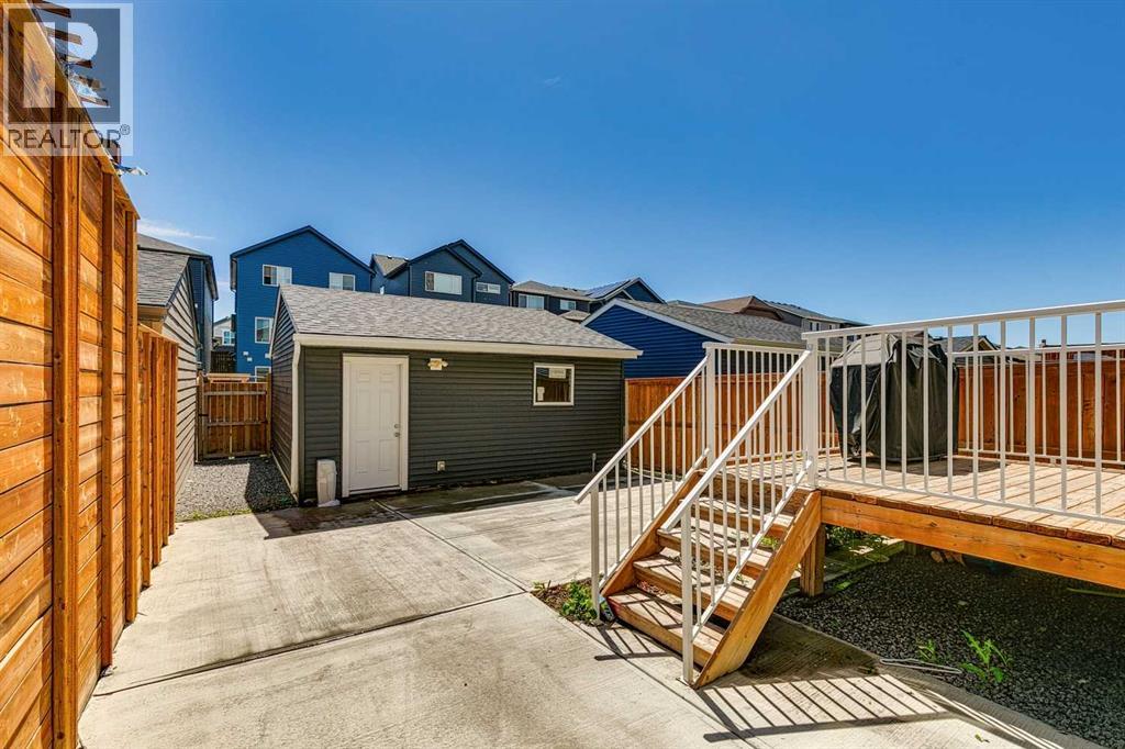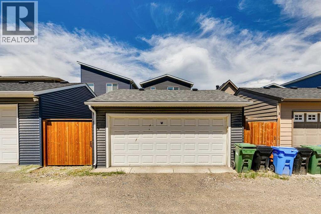 Welcome to this inviting and well-maintained home, offering fantastic curb appeal with a charming front yard that sets the tone for what’s inside. Step through the front door into a spacious foyer with a large closet, perfect for storing coats and shoes. The main floor features an airy living room with soaring ceilings open to above, hardwood floors, and tile for easy upkeep. The kitchen is a chef’s delight with stainless steel appliances, a built-in microwave, a breakfast bar, and a walk-in pantry. The sunny, south-facing dining area fills with natural light, and a convenient powder room completes the main level.Upstairs, you’ll find three comfortable bedrooms, including a primary retreat with a 3-piece ensuite, and a well-appointed 4-piece bathroom to serve the additional bedrooms. The basement is unfinished and ready for your personal vision—ideal for adding value and extra space.Enjoy outdoor living in the backyard, which features a good-sized deck, privacy partitions, low-maintenance landscaping, and convenient back alley access. Located within walking distance to the vibrant Livingston Hub and HOA amenities, and just minutes from Stoney Trail and Deerfoot Trail for a quick commute across the city, this home offers the perfect blend of comfort, convenience, and community living. (id:53676)