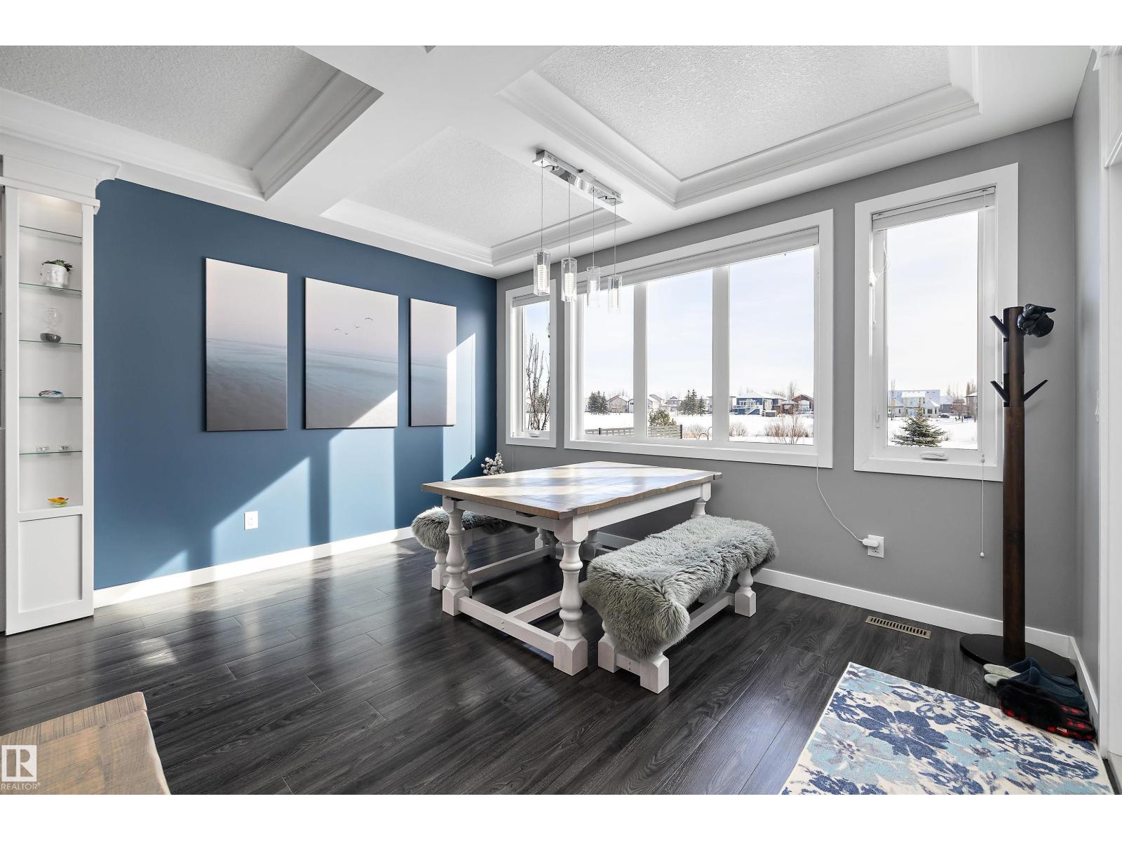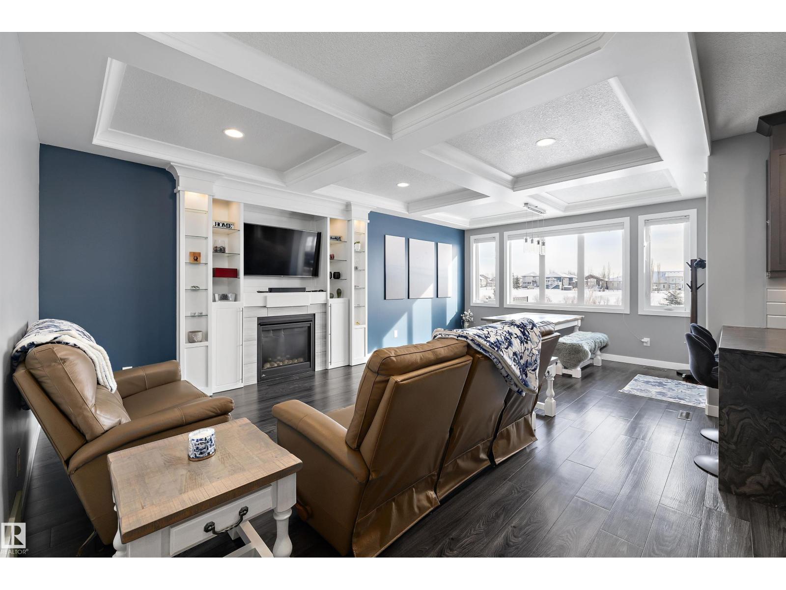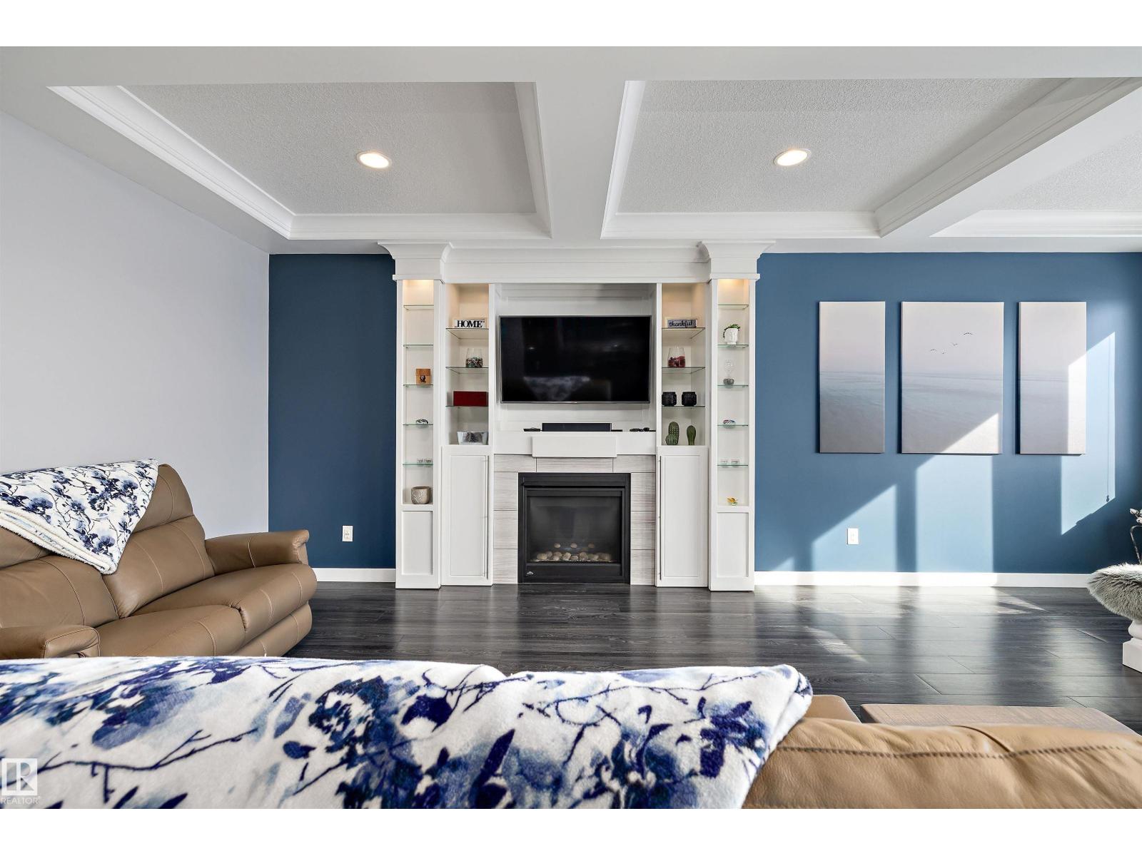 LAKEFRONT LUXURY | FULLY FINISHED | 4 BEDROOMS UP!!! Stunning lake-backing home by Atlas Premium Homes, known for exceptional quality and craftsmanship. Featuring 9’ ceilings and a bright open-concept main floor with coffered ceilings, custom gas fireplace, luxury granite, and a massive walkthrough butlers pantry—all w/breathtaking lake views. Upstairs offers a spacious bonus room w/balcony overlooking the lake, a beautiful primary suite, 3 additional bedrooms, dual-sink main bath, and a large laundry room. The fully finished 9’ basement adds extra living space. Upgrades include A/C, 20 solar panels(transferrable warranty), Enclosed 3-Season Sunroom overlooking lake w/epoxy floor, engineered hardwood upstairs(2022), fresh paint (2023), newer appliances, irrigation system, vinyl fencing, and professional stone landscaping w/turf so no mowing grass. Heated, finished garage with epoxy floors, TV setup, and 220V power. Quiet location steps to parks and trails—this meticulously maintained home shows 10/10. (id:53676)