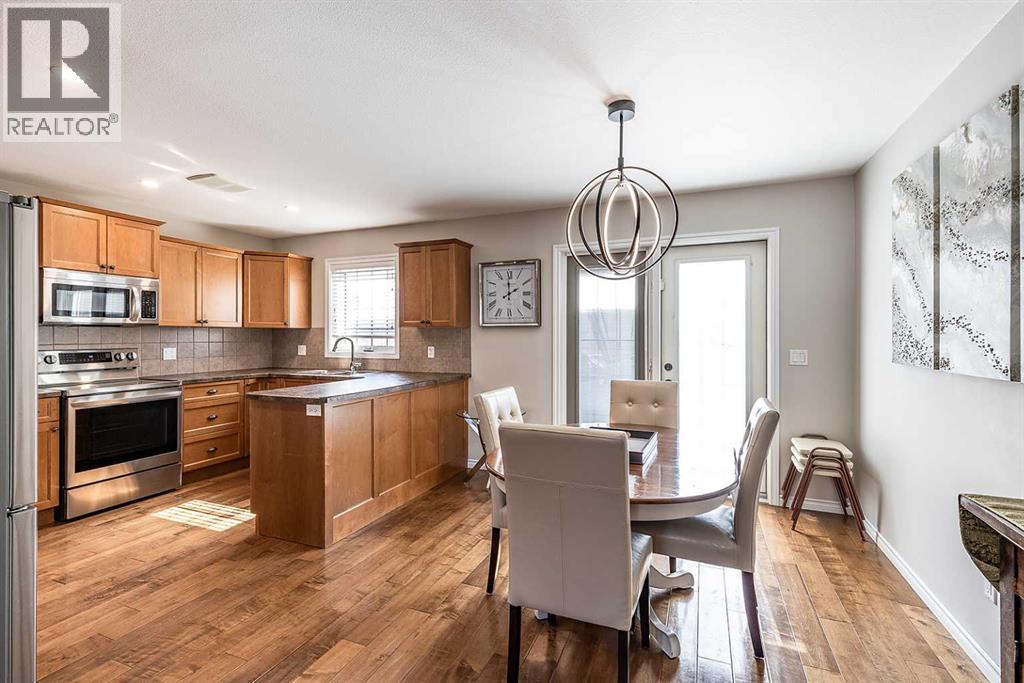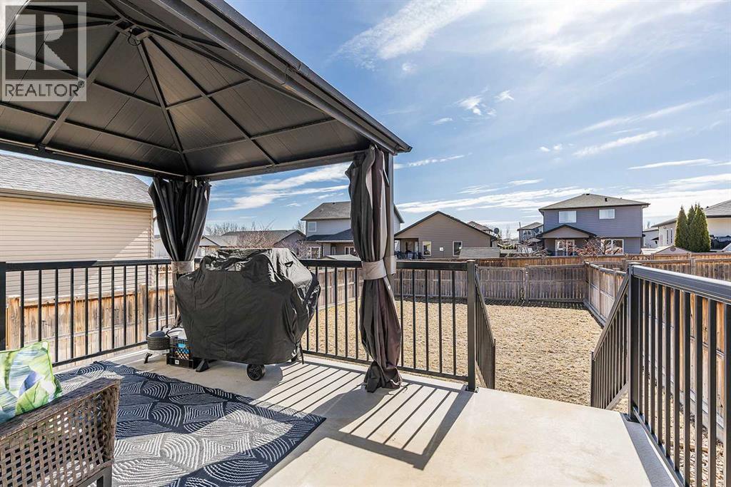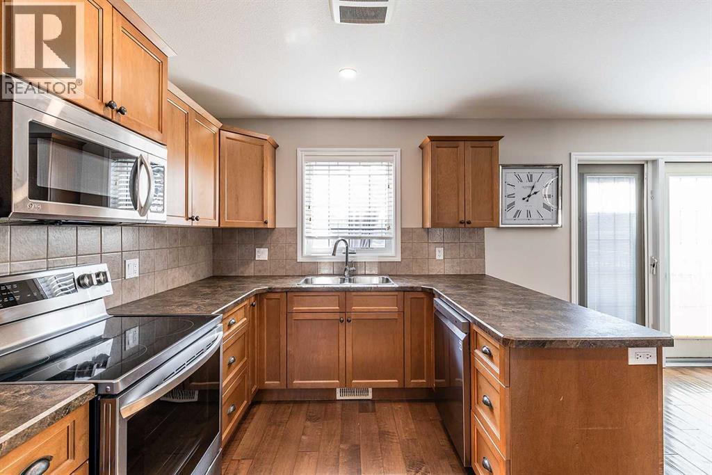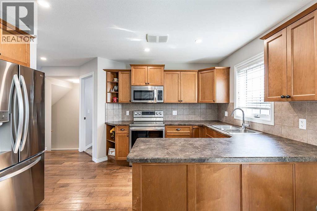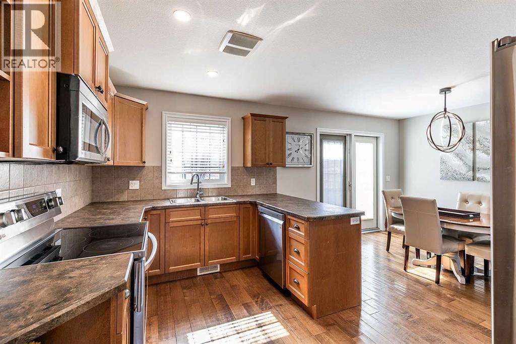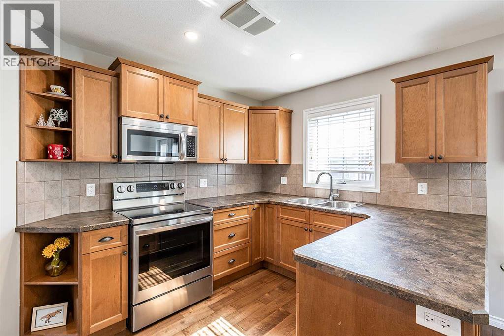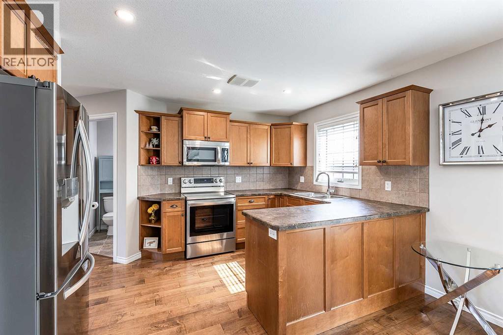 Welcome to Ranchlands — where this move-in ready home checks every box. Hardwood floors, flooded with natural light from oversized main floor windows, set the tone the moment you walk in. The kitchen is built for real life with plenty of maple cabinetry, generous counter space, and updated appliances (2021). A convenient powder room with in-suite laundry (washer/dryer 2021) and direct backyard access round out a main floor that just works. Upstairs, three well-sized bedrooms offer comfort and flexibility. The primary bedroom fits a king with room to spare. The main bath is a standout with a jetted soaker tub, separate shower, and more space than you'd expect. The lower level is where this home truly steps ahead: a fully finished, permitted basement with a 3-piece bathroom ready for a family room, home office, or gym. Out back, a private deck with gazebo (2021) overlooks a fully sodded yard (2022) with enough room for a future garage or RV pad, a rare find in an established neighbourhood. Additional updates include a new hot water tank (2022). This one is priced to move and built to impress. (id:53676)